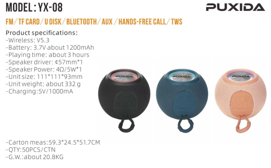 PARLANTE BT/RADIO/USB/AUX/SD/1200MAH PUXIDA YX-08