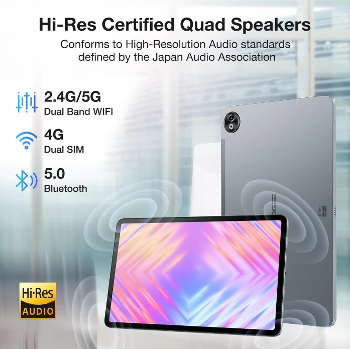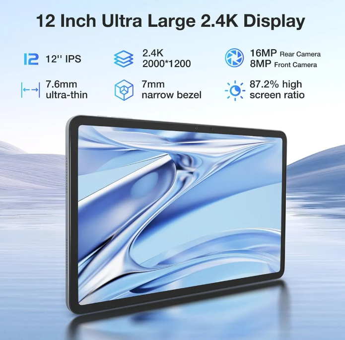 Tableta de 12 pulgadas + pantalla de 2,4K】 La tableta DOOGEE T20 Ultra está equipada con una pantalla IPS de protección ocular TUV de 12 pulgadas. Esta tableta Android tiene una pantalla grande casi sin marco, pesa solo 568 gramos y mide solo 7,6 mm de grosor. La tableta también es compatible con Widevine L1, por lo que puede ver videos de alta definición de 1080p en cualquier momento. La tableta tiene cuatro altavoces de alta resolución para una experiencia de cine en casa excepcional