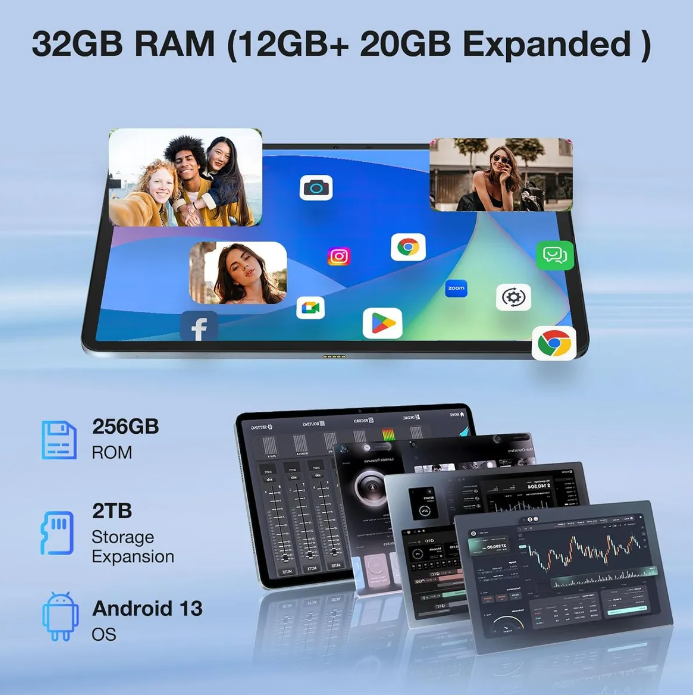 32 GB RAM + 256 GB ROM + 2 TB TF】 La tableta tiene 32 GB de RAM (12 GB fijos + hasta 20 GB ampliables), lo que puede ofrecer una experiencia de funcionamiento fluida, ya sea que juegues o abras aplicaciones en esta tableta de 12 pulgadas. La tableta viene con 256 GB de almacenamiento incorporado, ampliable hasta 2 TB con una tarjeta TF, lo que le permite almacenar toneladas de sus fotos y videos favoritos y descargar sus aplicaciones favoritas desde Google Play Store.